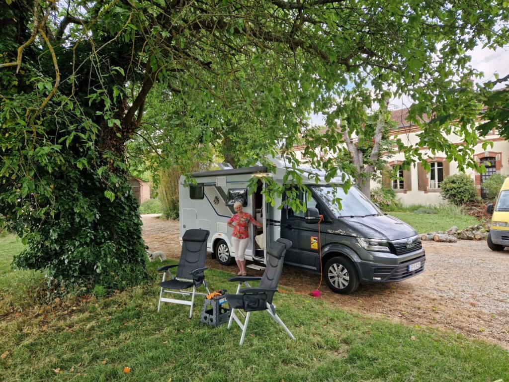 Vi blev visade en fin ställplats vid huvudbyggnaden.