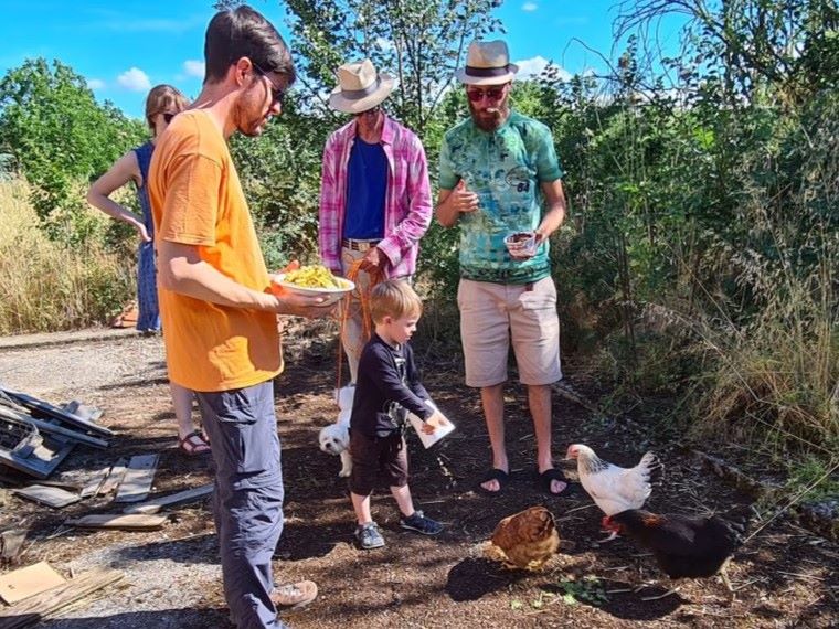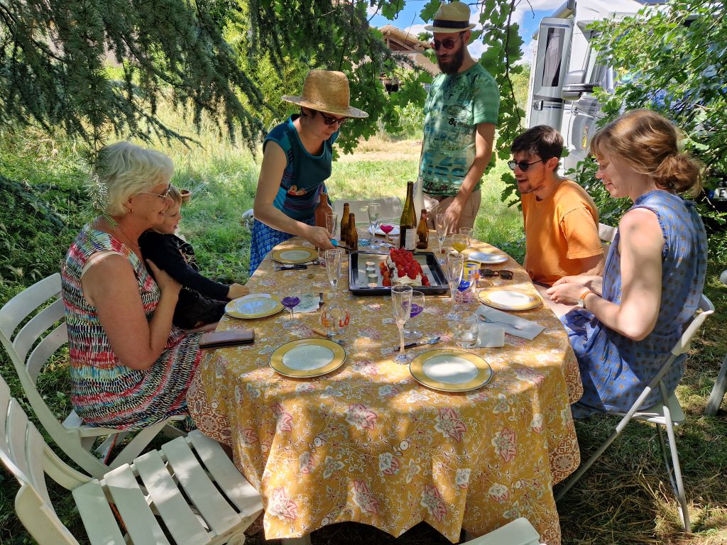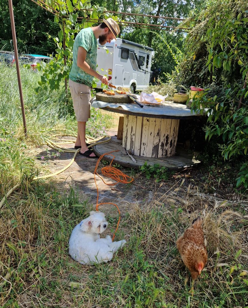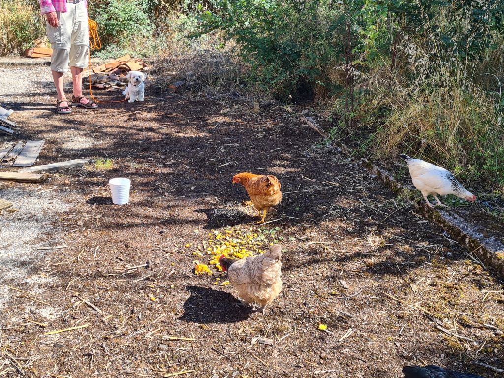 Efter vattenleken åkte vi till Lisle-sur-Tarne vid Gaillac för att äta lunch hos Cecilia och Vincent. Det är hos dem vi har Bohem. De bor i ett närmare 200 år gammalt hus i utkanten av den lilla byn. De har en stor tomt och ett hönshus med fyra fina hönor.