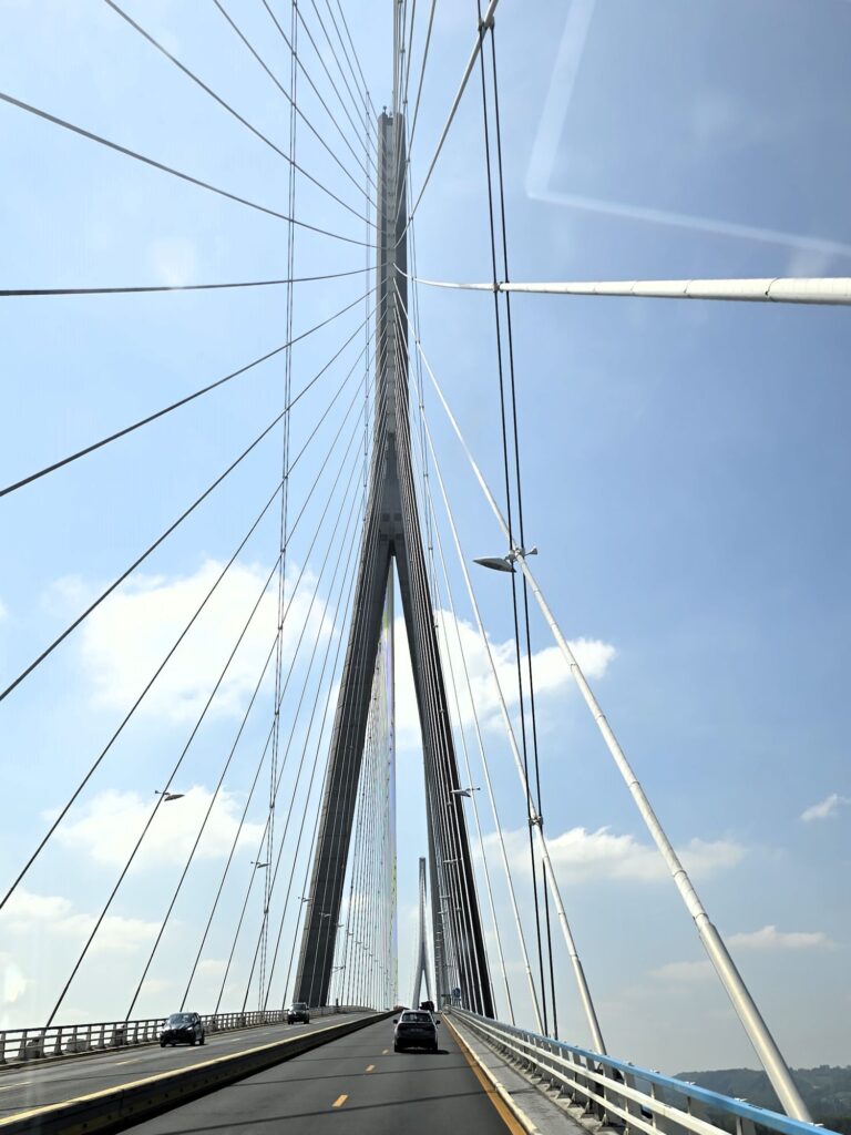 På torsdag morgon tog vi oss vidare och körde över den imponerande bron vid Seines utlopp, Pont de Normadie.