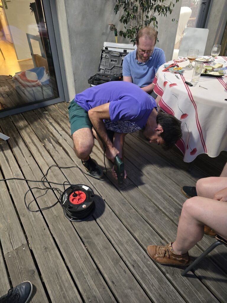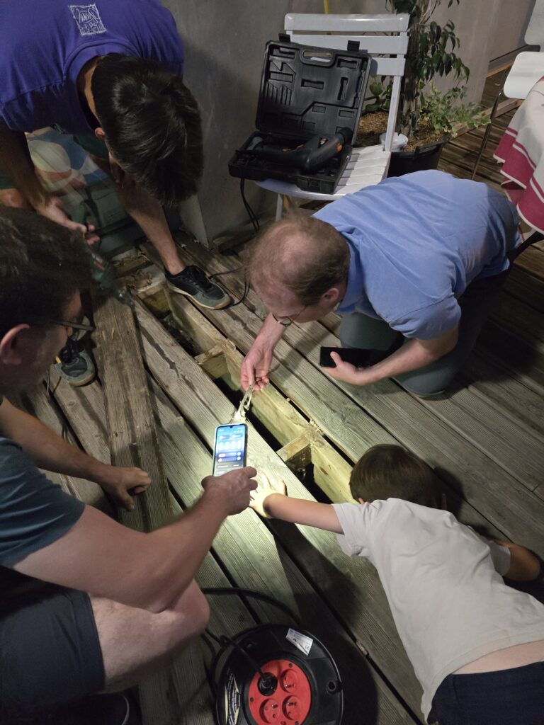 Men lite spännande blev det när en av gästerna lät en baby ta hand om hans telefon. Hoops, där föll den – genom altangolvets springor. Fram med skruvdragare och kablar, och snart var telefonen återfunnen.