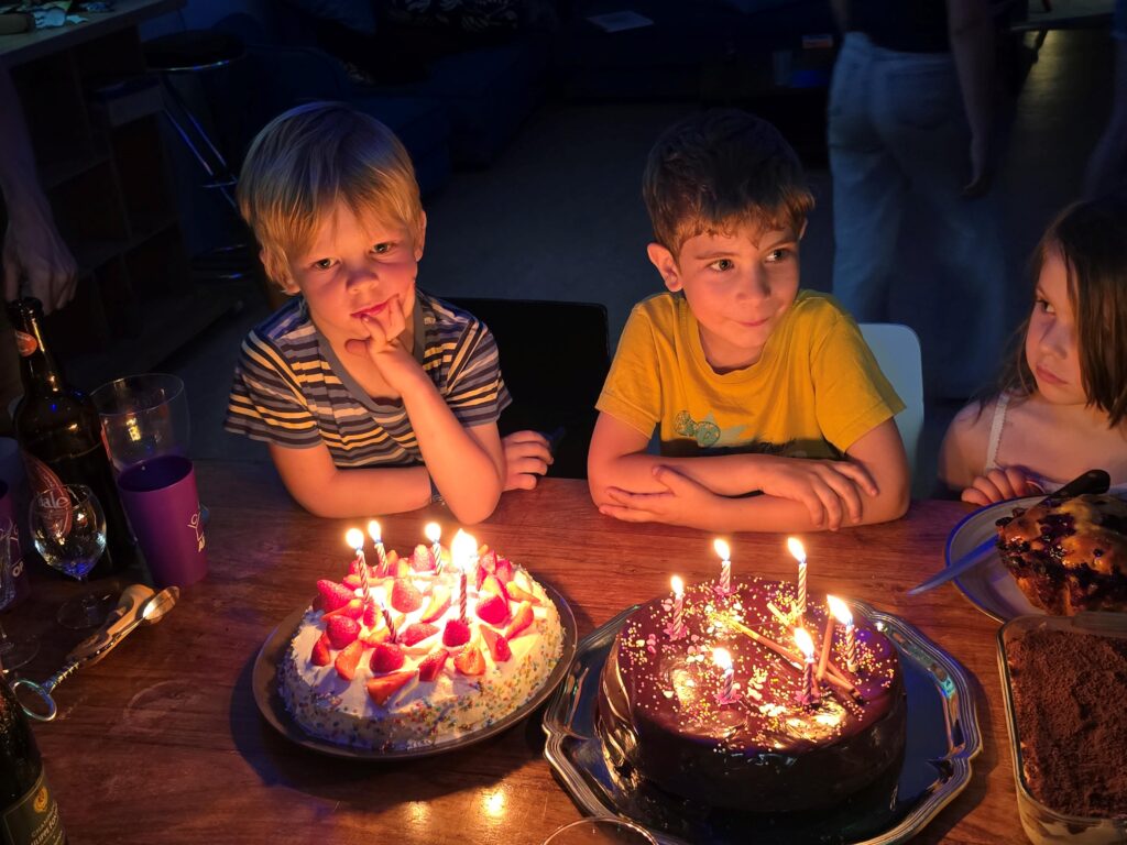 Senare på kvällen var det dags för Abricoop middag, knytkalas med barn och vuxna från hela huset. Nu blev det också sång och tårta för Elias och Bastian.